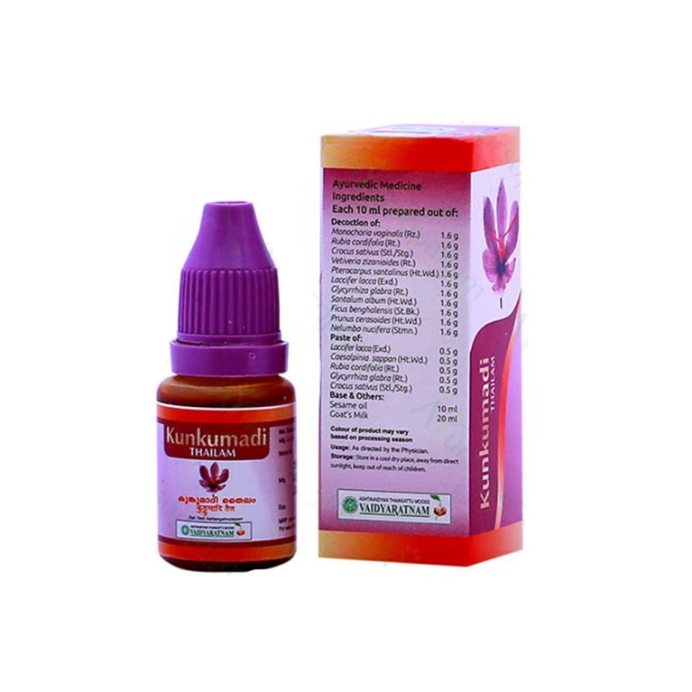 Устраняет пигментные пятна, образующиеся в период активного солнца. Масло Кумкумади является гипоаллергенным и благотворно воздействует на все типы кожи, в том числе жирную и комбинированную.