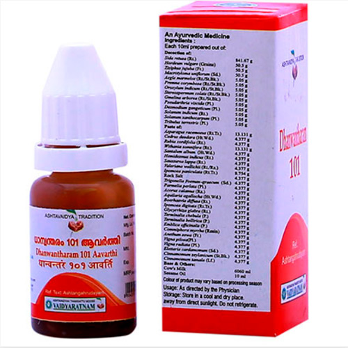 Dhanwantharam 101 Vaidyaratnam (Масло Дханвантарам 101)10мл-Одним из наиболее важных свойств этого масла является его способность улучшать состояние здоровья женщин в период беременности, а также в период восстановления после родов. Компоненты этого масла укрепляют костную ткань, предотвращают разрушение зубов.Масло эффективно для лечения нейромышечных заболеваний и устранения болей при травмах костей и суставов.