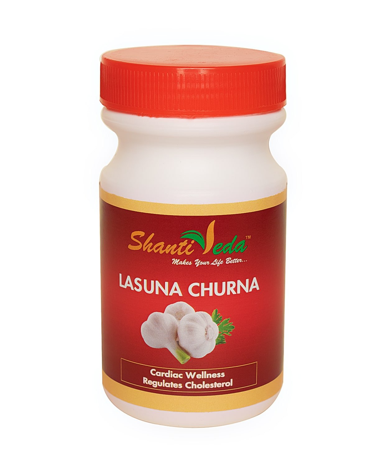 Ласуна (Allium sativum). Чеснок, используемый в аюрведе в качестве лекарства. Он смягчает обострения ваты, понижает капху, повышает питту. Вкус острый, энергетика согревающая. Считается омолаживающим средством, особенно влияя на нервную и костную ткани. Облегчает боли в суставах, помогает при ревматизме, сухом кашле, применяется при зубной боли, повышенном холестерине, отеках, паразитах. Препятствует отложению холестериновых бляшек на стенках сосудов и помогает сохранять нормальную коронарную функцию. Содержит кальций, фосфор и железо, небольшое количество йода, хлора и серы, а также аллисатин и аллицин.