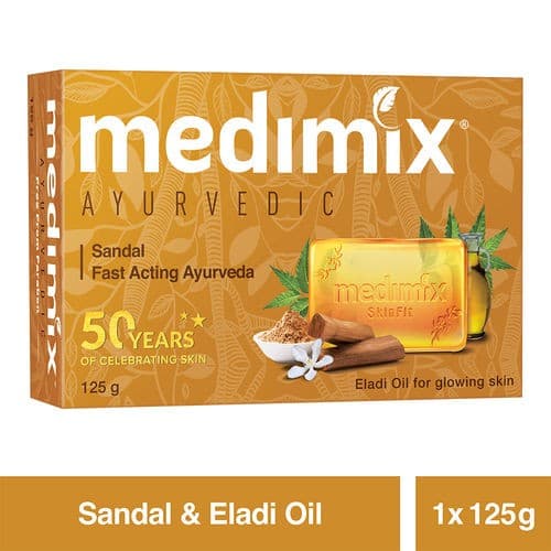 Soap Medimix Sandal ( Мыло Медимикс Сандал ) 125 гр - Мыло Сандал предназначено для очищения любой кожи лица, тела и рук, ее увлажнения, смягчения, питания. Оно произведено вручную на основе сандалового масла и многокомпонентного сбора целебных трав, оказывающего помощь при кожных проблемах. Мыло поддерживает природный цвет и здоровье кожи, обладает осветляющим действием – оно отбеливает участки потемневшей кожи, пигментные пятна.В его состав входят ним с его антибактериальными качествами, растительная смола гуггул, черный тмин, кедр, солодка, кумин, масло Элади (кардамона) и сандал, сохраняющий кожу чистой, молодой, упругой.Мыло обладает отличными потребительскими качествами: оно невероятно ароматное, сандалом начинает нежно пахнуть кожа, открытая пачка может даже ароматизировать помещение; мыло прекрасно пенится, при этом оно экономично и служит долго, доставляя радость пользователю.