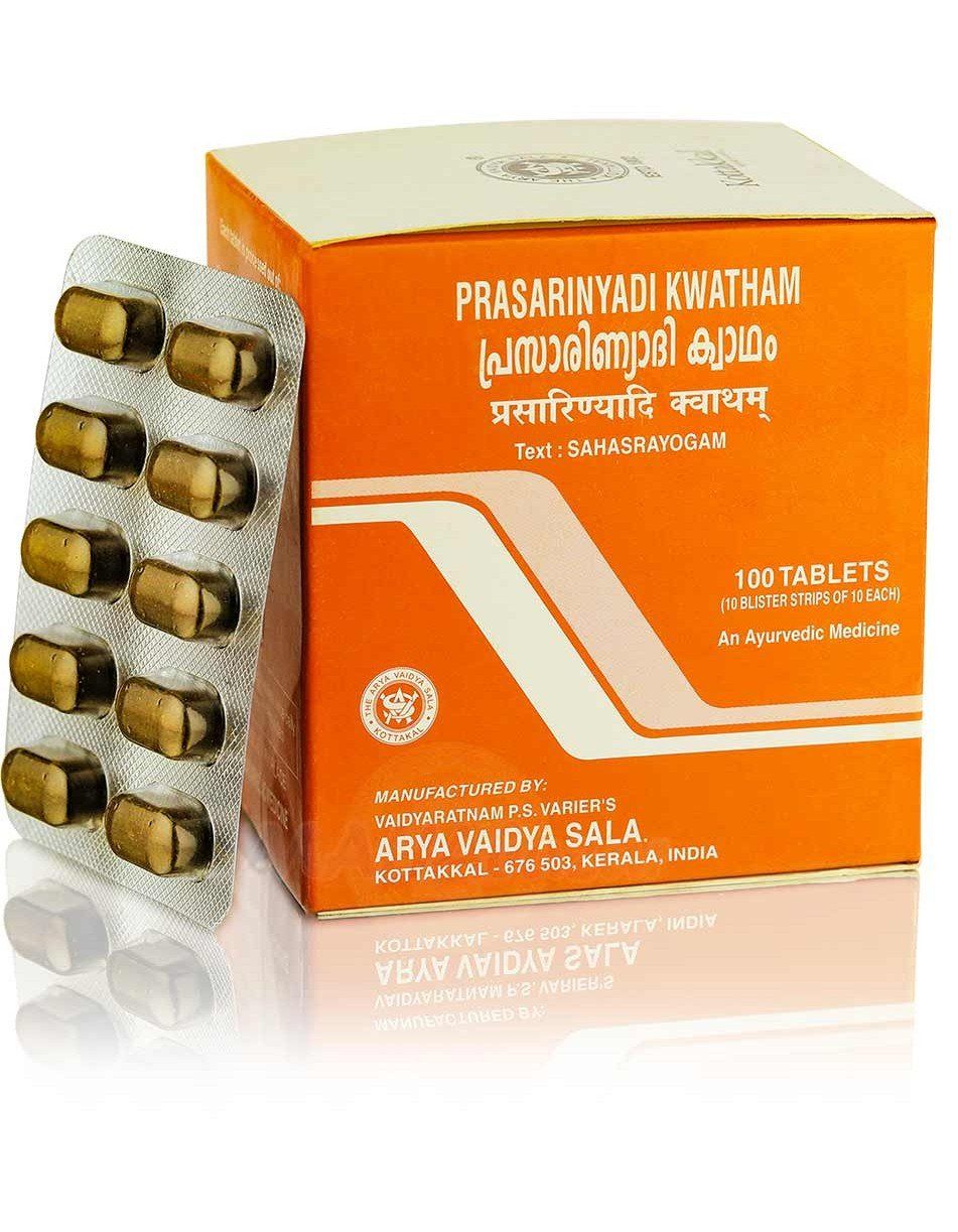 Состав Прасариньяди Кватхам: Сарани (Merremia tridentata) - 1.851 г, Урд (Vigna mundo) - 1.851 г, Бала (Sida cordifolia) - 1.851 г, Лук репчатый (Alium cepa) - 1.851 г, Рашна (Alpinia galanga) - 1.851 г, Имбирь (Zingiber officinalis) - 1.851 г.